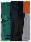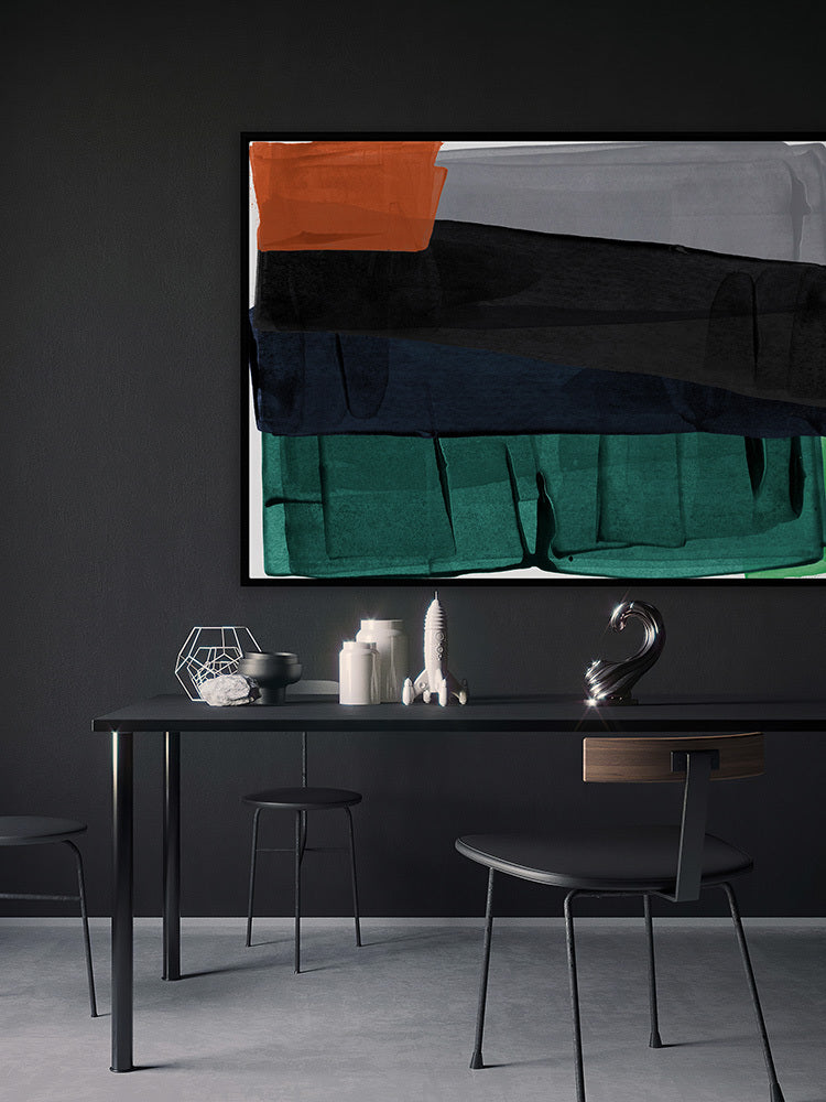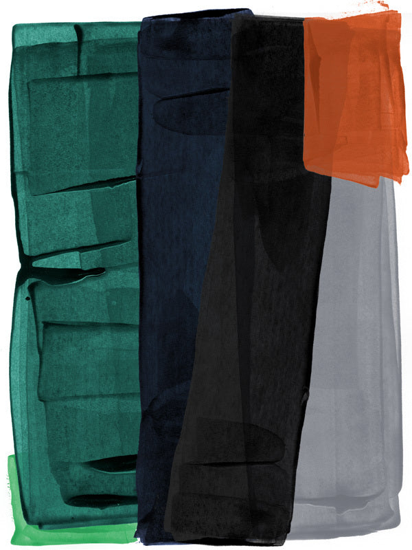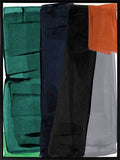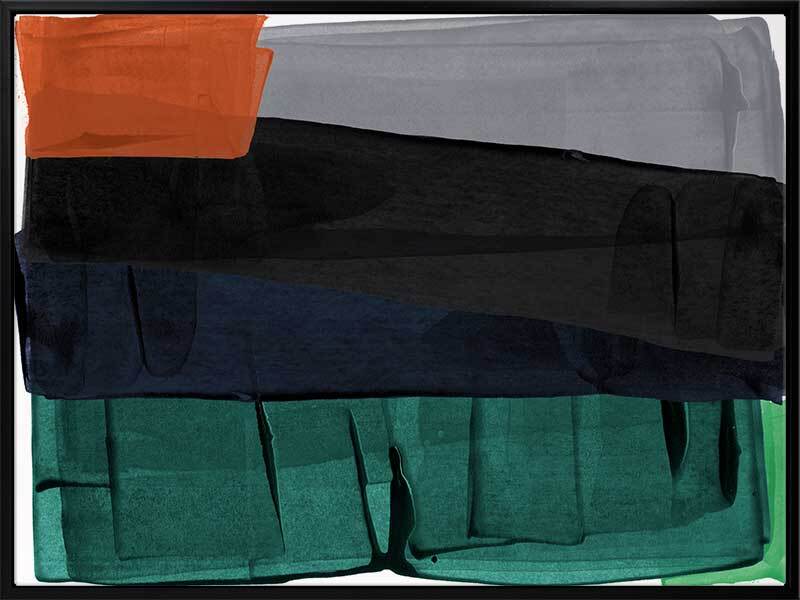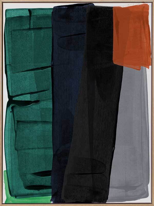 Bloomsbury Canvas Art Print: A simple abstract artwork featuring bold, overlaid teal, navy, black, orange and grey paint strokes.