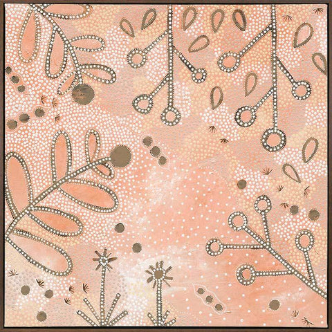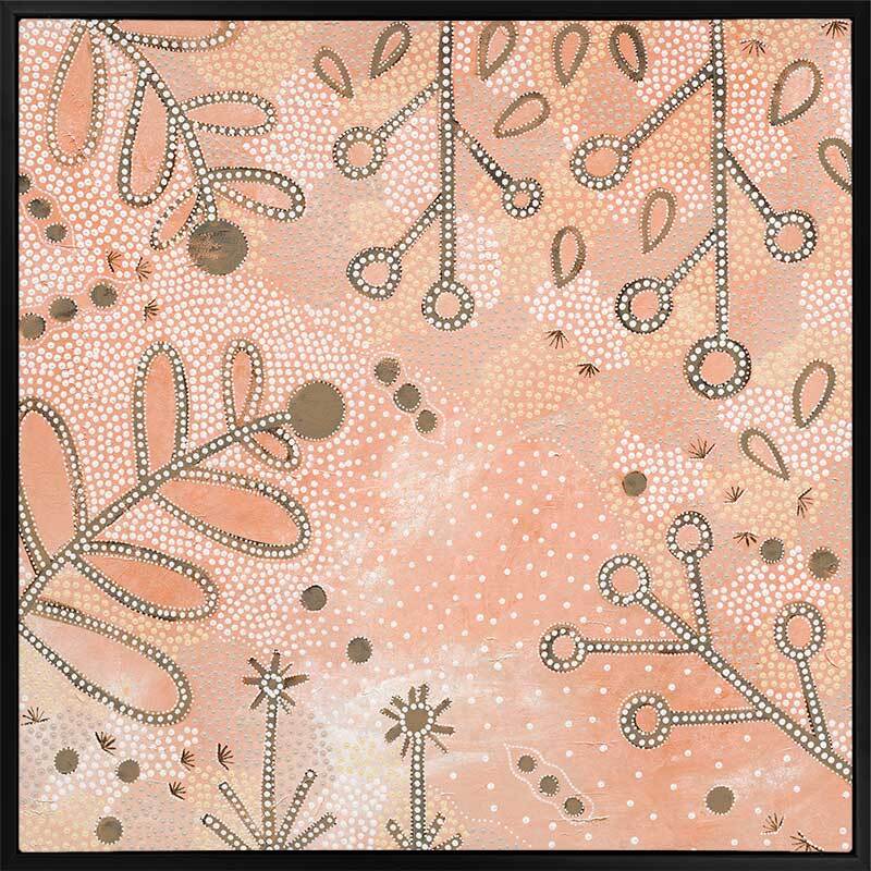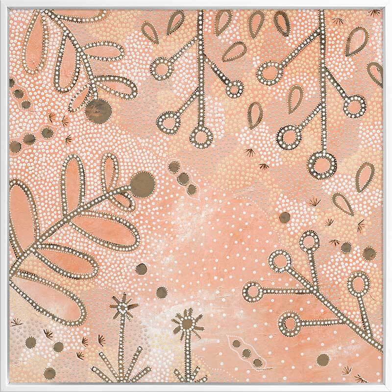 Dharrabu Canvas Art Print - A soft, intimate Aboriginal piece with a rather unique colour palette of salmon pink, pastel yellow, chocolate brown, and white accents. This artwork can brighten any room, with its study of swaying plants and flowers, releasing petals as they fall to the ground.