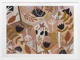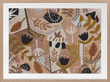 Earthy Patch Framed Art Print - This warm, boho inspired abstract artwork layers organic colours, botanical shapes, and interesting textures, creating a patchwork style piece. The colour palette is grounded and earthy, featuring an array of brown, beige, mustard and cream.
