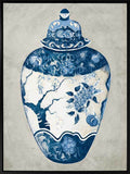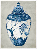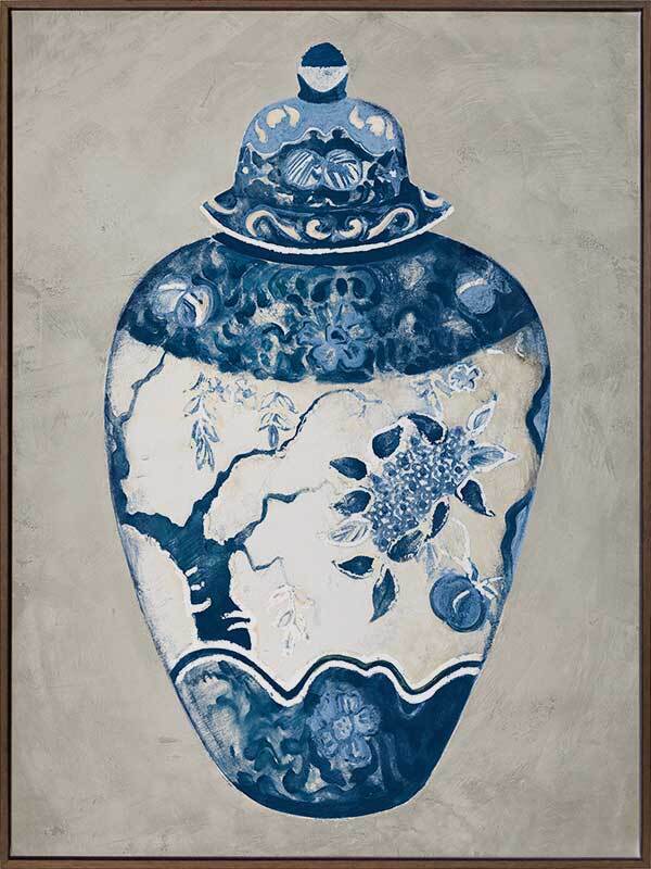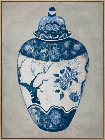 Ginger I Canvas Art Print - Quintessential Hamptons chic comes to life in this incredible art print featuring an intricately painted ginger jar. The blue and white jar features ornate, floral motifs, and is contrasted against a textured grey background. Pairs with Ginger II.