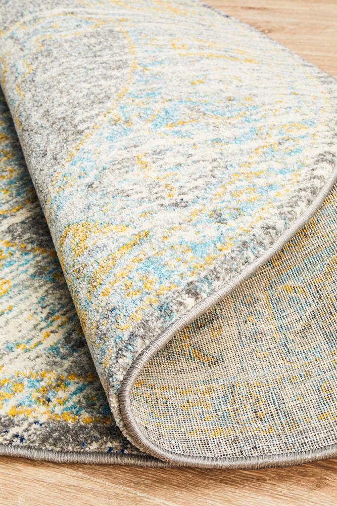 The Legion Millennium Grey Round Transitional Rug from our Legion range has a grey context with sporadic geometric patterns displayed in aquatic and sunny hues.