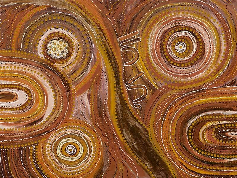 Ngurrbul Dark Canvas Art Print - Free flowing lines are surrounded by hypnotic and intricate concentric circles in this warm and rich contemporary Aboriginal artwork piece. Created by talented Wiradjuri artist, Amanda Hinkelmann, this piece is inspired by a traditional Wiradjuri love story, and features a deep, earthy colour palette of mustard, ochre, and brown tones, highlighted with white accents. This painting shares a traditional Wiradjuri love story. The story of two young lovers, Pomingalana and Gobbagombalin, from different tribes and opposite sides of the river, who had fallen into a forbidden love. For every artwork sold, a percentage of the sale price goes directly back to the artist.