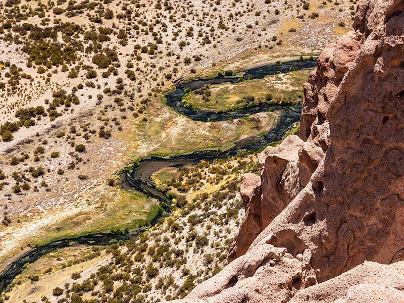 River Valley Canvas Art Print - This striking and textural photographic artwork is an aerial view of an emerald green river winding through a dry, arid desertscape and overlooked by tall canyon walls. The warm, earthtoned colour palette is rich with natural browns and greens.
