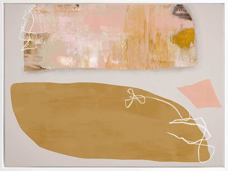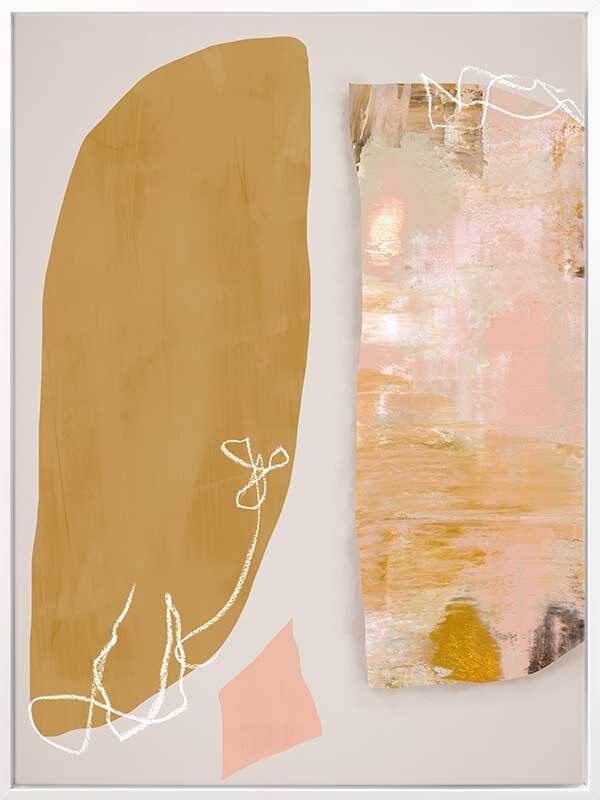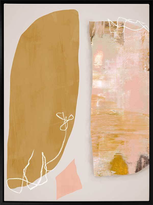 Traveller II Canvas Art Print: A unique, textural abstract artwork featuring bold shapes and textures in a warm pink, beige and mustard colour palette. Pairs with Nomad I.